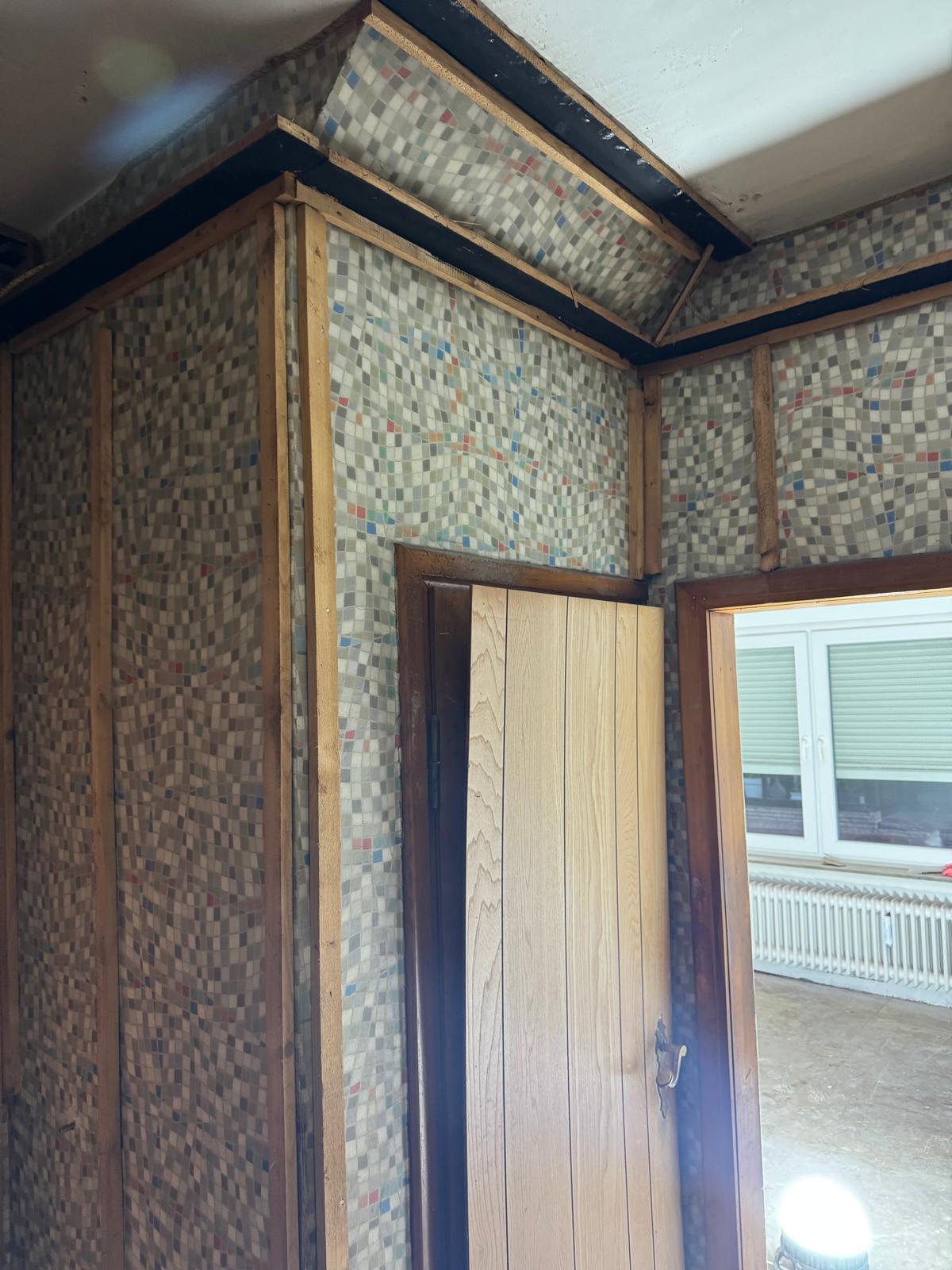 Unter der alten Verkleidung: eine originale Tapete aus den 60er-/70er-Jahren. Mit Tapetenleisten.
